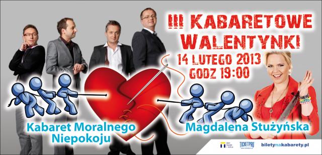 Już po raz trzeci proponujemy Państwu spędzenie tego wyjątkowego wieczoru na wesoło i zapewniamy, że jest to doskonały pomysł. Tym razem gościć będziemy pochodzący z Warszawy Kabaret Moralnego Niepokoju, który po ogromnym sukcesie ostatniej trasy pt. „Galaktikos” ruszył z przedpremierowymi pokazami nowego programu. Programu, który jak zwykle zawiera mnóstwo zabawnych gagów, żartów i anegdot. KMN popularność zdobył dzięki częstym występom w telewizji oraz błyskotliwym tekstom Roberta Górskiego. W emitowanym w latach 2003-2006 w TVP2 autorskim programie satyrycznym grupy pt. Tygodnik Moralnego Niepokoju co tydzień prezentowane były premierowe skecze. Kabaret skupia się głównie na sprawach społecznych, absurdach życia codziennego, nie stroni też od polityki – nieraz w ich skeczach można odczuć cyniczne uwagi skierowane w stronę „organów rządzących”. Na przełomie 2007 i 2008 roku kabaret tworzył program pt. Miesięcznik Moralnego Niepokoju. Cechą rozpoznawczą Kabaretu Moralnego Niepokoju jest to, iż na scenie oprócz aktorów pojawiają się również muzycy, którzy wzbogacają cały występ i nadają mu żywy i niepowtarzalny charakter. Obecnie z Kabaretem Moralnego Niepokoju występuje Magdalena Stużyńska, urocza kobieta o niezwykłej urodzie, znana z roli Marcysi w serialu „Złotopolscy”, a także z niezliczonej ilości produkcji filmowych i teatralnych.